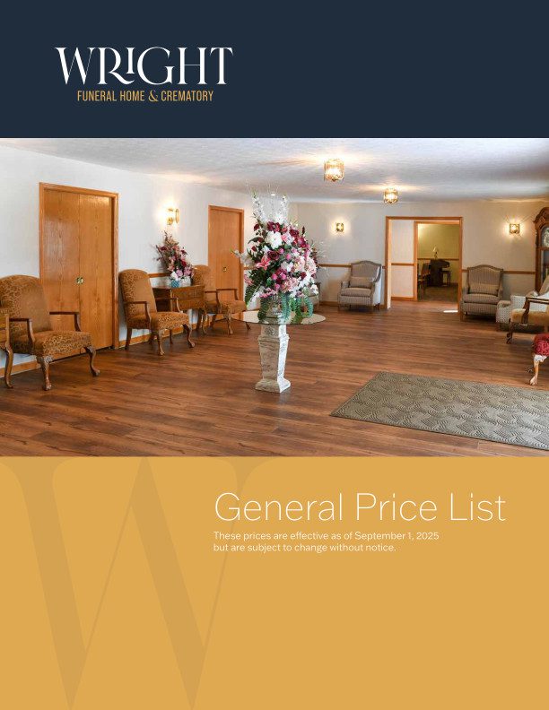 Many funeral service providers advertise and quote incomplete low prices and then disclose the full cost later. Wright Funeral Home and Crematory does not. Our helpful and friendly staff are here to discuss your questions and concerns regarding pricing. Every service provider is required to have and provide a general price list. It is exactly what it sounds like. General. It is an itemized list of every fee a funeral home has.